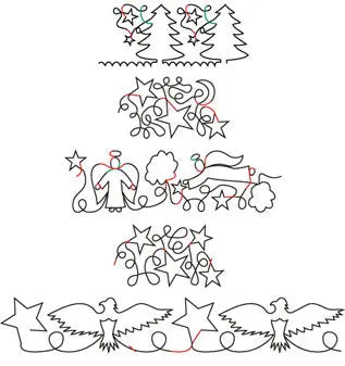 Beautiful continuous line pantograph patterns exclusively designed for mid-arm, short-arm and domestic machines. Each pattern on the roll is 4 inches wide and 5 different patterns come on each of the rolls.