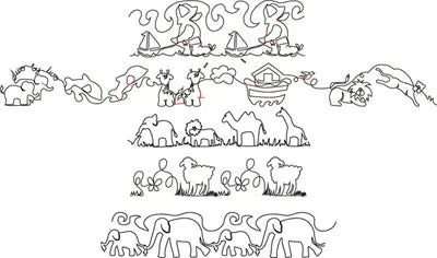 Beautiful continuous line pantograph patterns exclusively designed for mid-arm, short-arm and domestic machines. Each pattern on the roll is 4 inches wide and 5 different patterns come on each of the rolls.