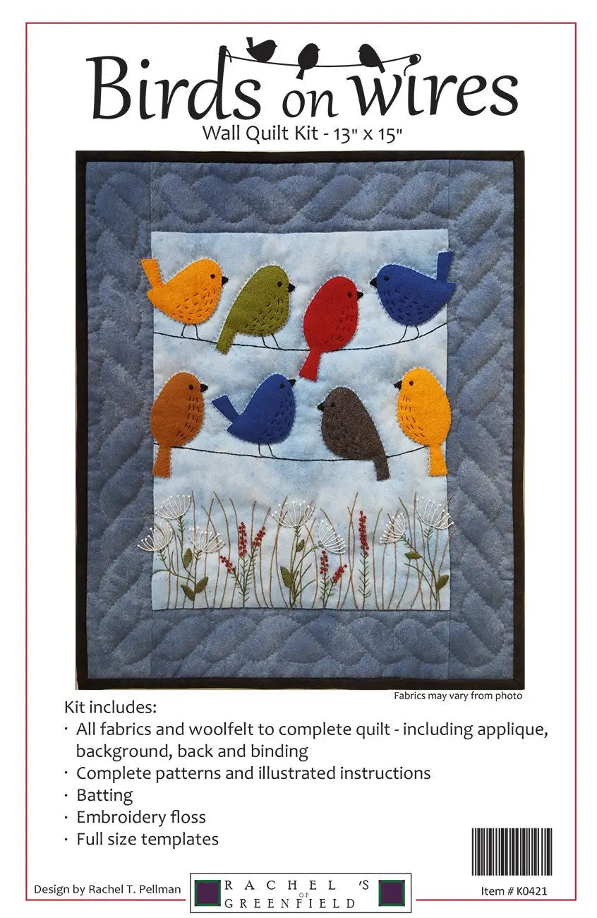 Bright, whimsical birds gather on wires to enjoy their peaceful landscape. The meadow beneath is filled with grass and wildflowers. A graceful quilted cable surrounds the scene. Finished size is 13”x 15”.