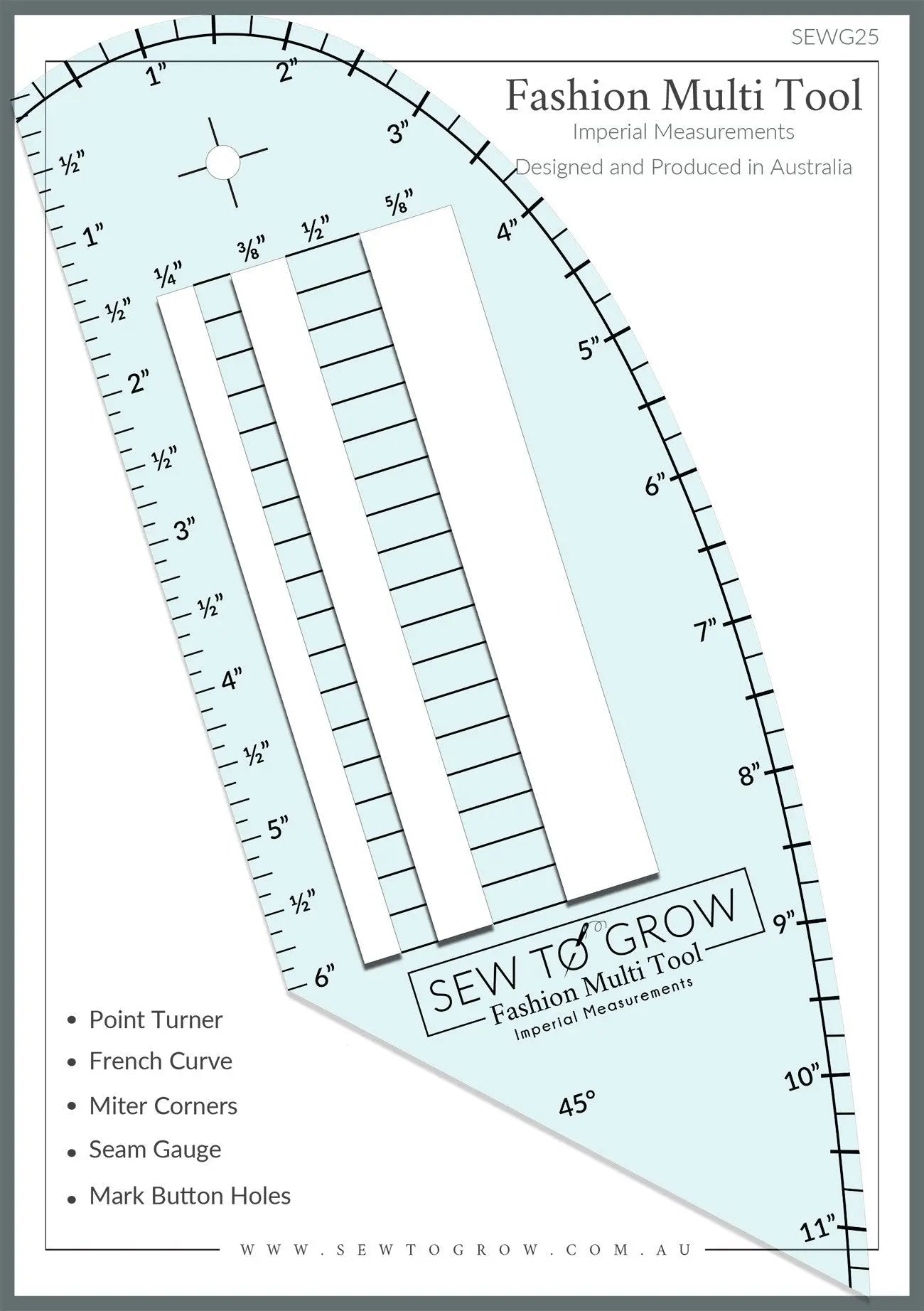Fashion Multi Tool: If you are serious about learning to make clothing or are already an avid seamstress then the Fashion Multi Tool is everything you need for designing and making garments all in one convenient and compact tool. This tool features a french curve, seam gauge, point turner, mitering tool, hemmer and button hole placement.