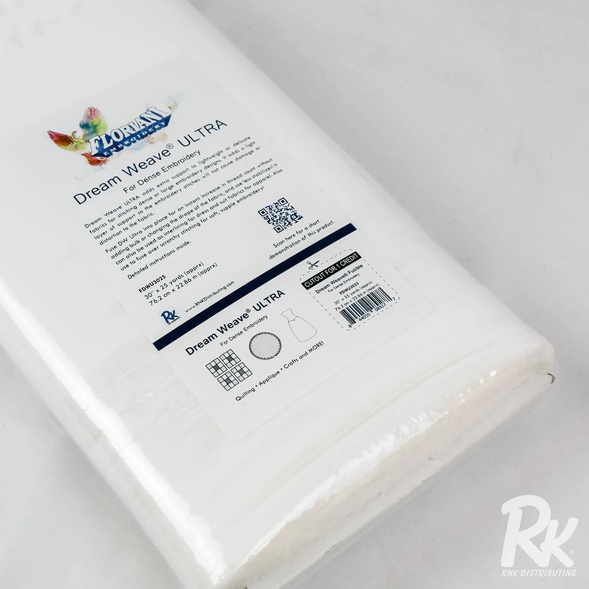 Floriani Dream Weave Supreme fusible adds extra support to light weight, loosely woven or delicate fabrics when embellishing with embroidery, appliqué, or quilting. When stitching dense or large embroidery designs, Floriani Dream Weave Supreme adds a crucial layer of support so the embroidery stitches will not cause damage or distortion to the fabric.