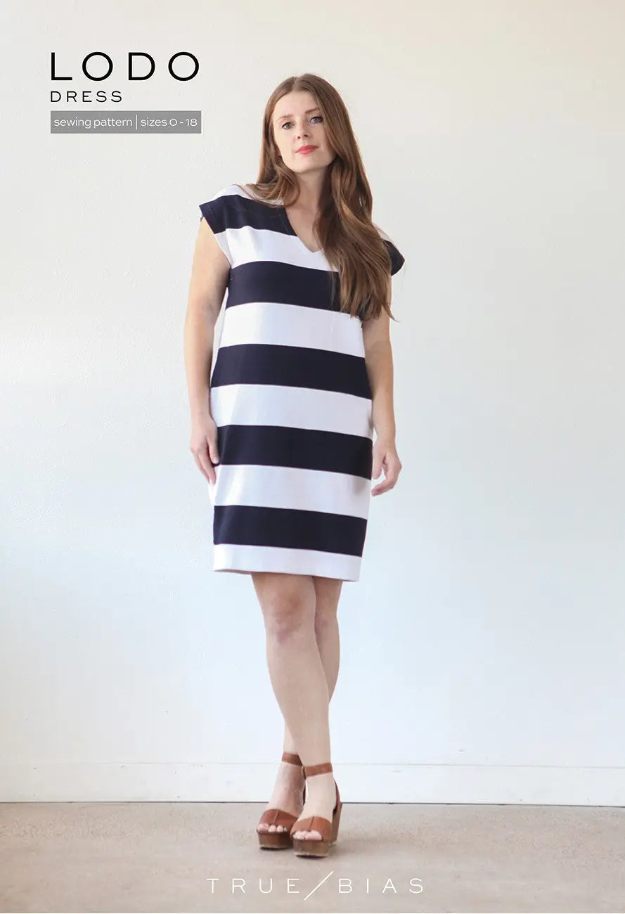 The Lodo pattern is an elevated take on a basic t-shirt dress. It has a straight fit through the waist and hips and a slightly tapered hem to create a subtle cocoon shape. It has a V neck at center front and an extended cap sleeve. Both the neckline and armholes are finished with a woven facing for stability and structure. View A has a hem that hits at mid calf with a slit at center back for moveability. View B’s hem hits a couple of inches above the knee.