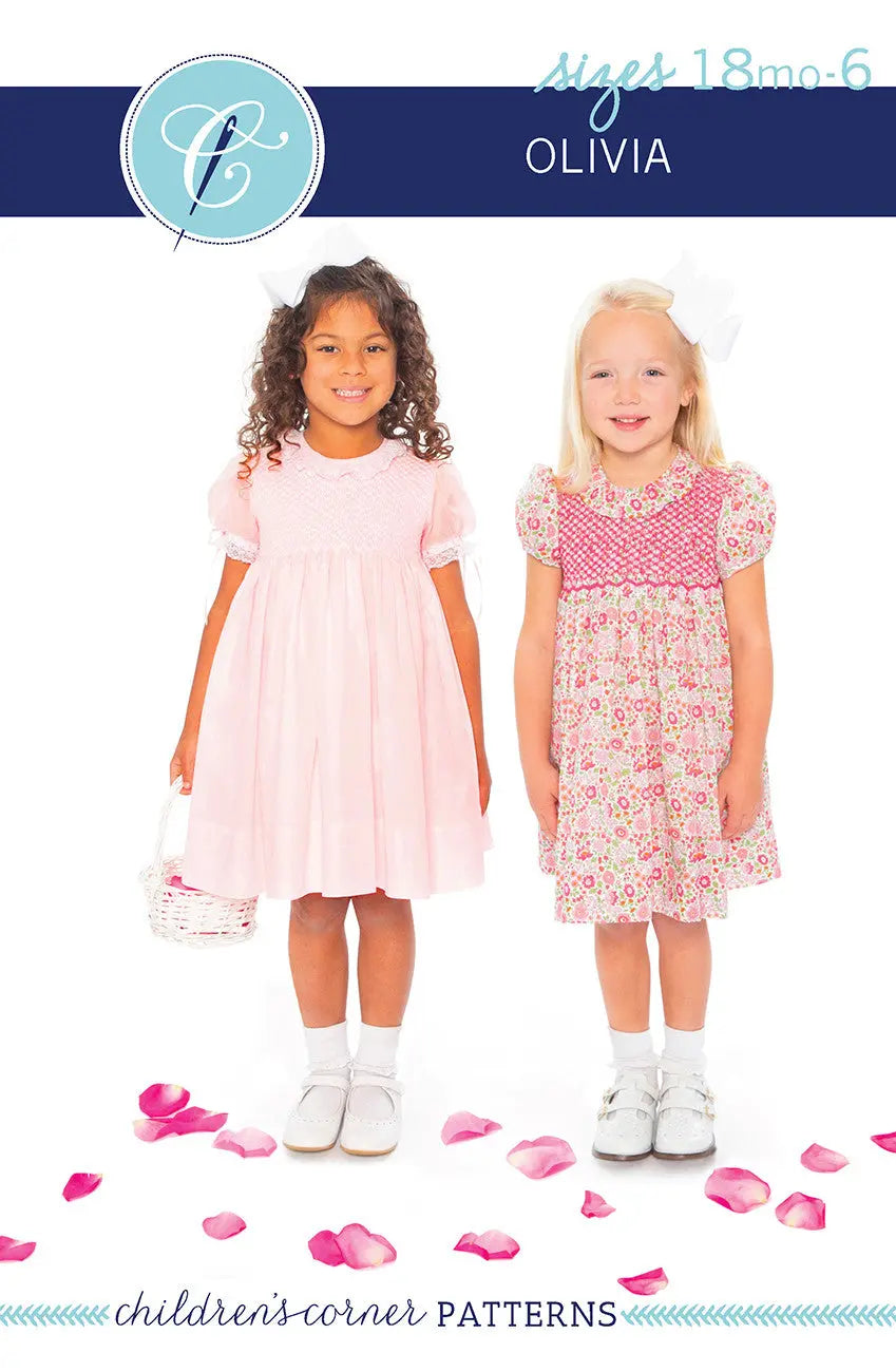 Olivia is a classic bodice dress smocked from the shoulder. VIEW A has short puff sleeves and ruffle collar. VIEW B allows for heirloom touches, including lace edging at the neckline and sleeves finished with Swiss beading. The back closes with buttons and a continuous bound placket. The sash can be made on either view. Geometric smocking design, Eliza, is included.