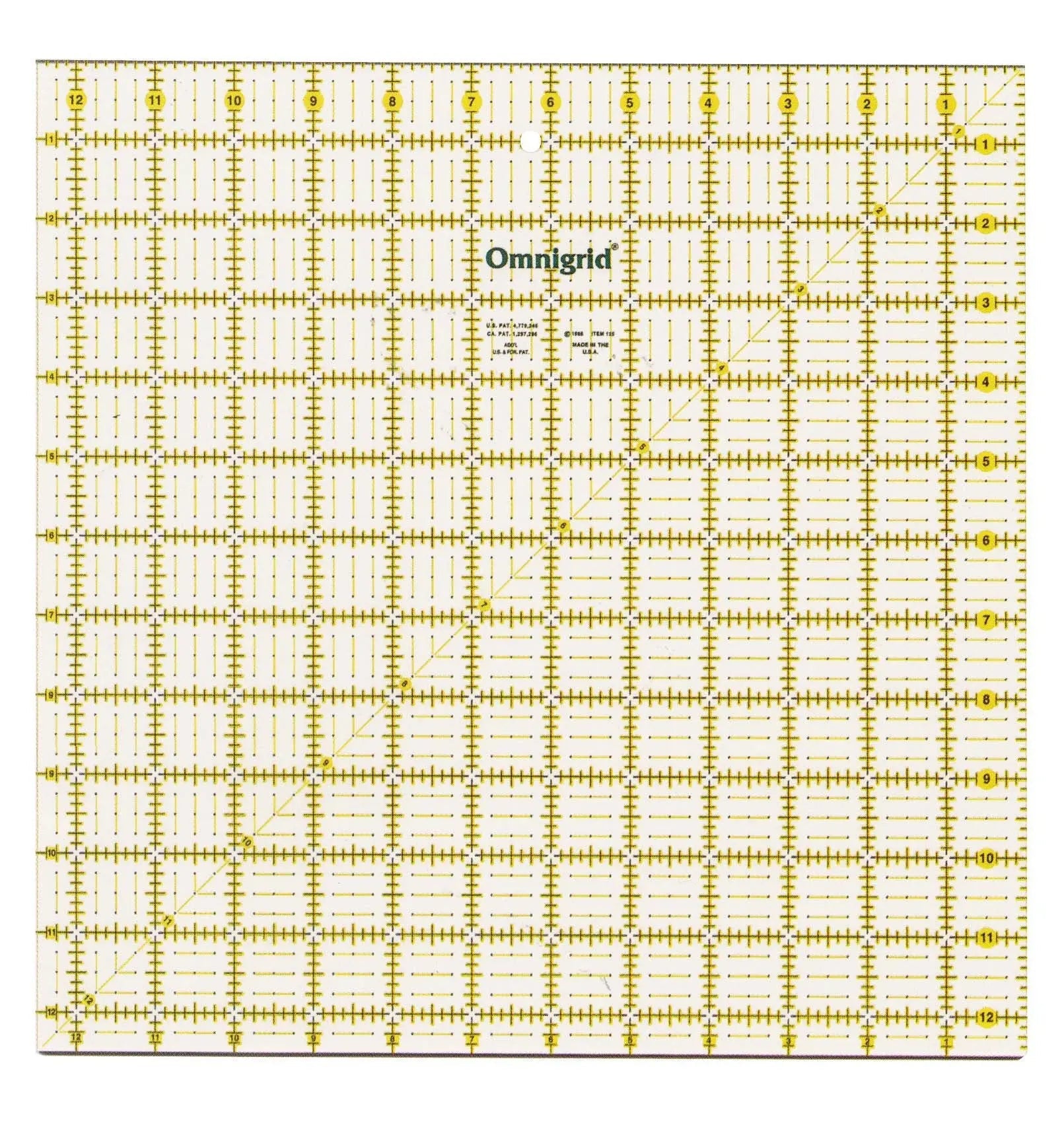 The Omnigrid 12.5in x 12.5in ruler features an extra 1/2in width for seam allowances; it is used to cut, square and trim blocks sized 12.5in and under when quilting. In general, Omnigrid square rulers are used for secondary cutting of strips, and to square up finished quilt blocks.