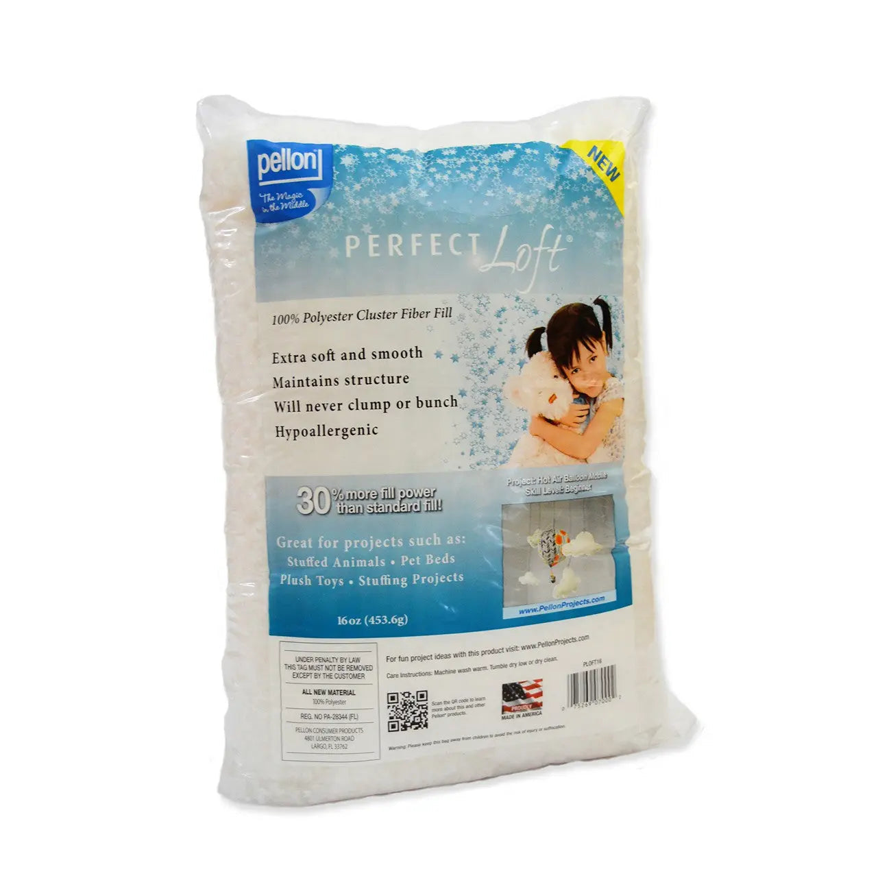 Perfect Loft® 100% polyester cluster fiber fill is perfect for your craft & home décor projects. It is soft while maintaining structure and won’t ever clump or bunch. It is great for projects such as stuffed animals, pet beds and decorative pillows. Hypoallergenic. Stays soft while maintaining structure. Won’t ever clump or bunch. 30% more fill power than standard fill