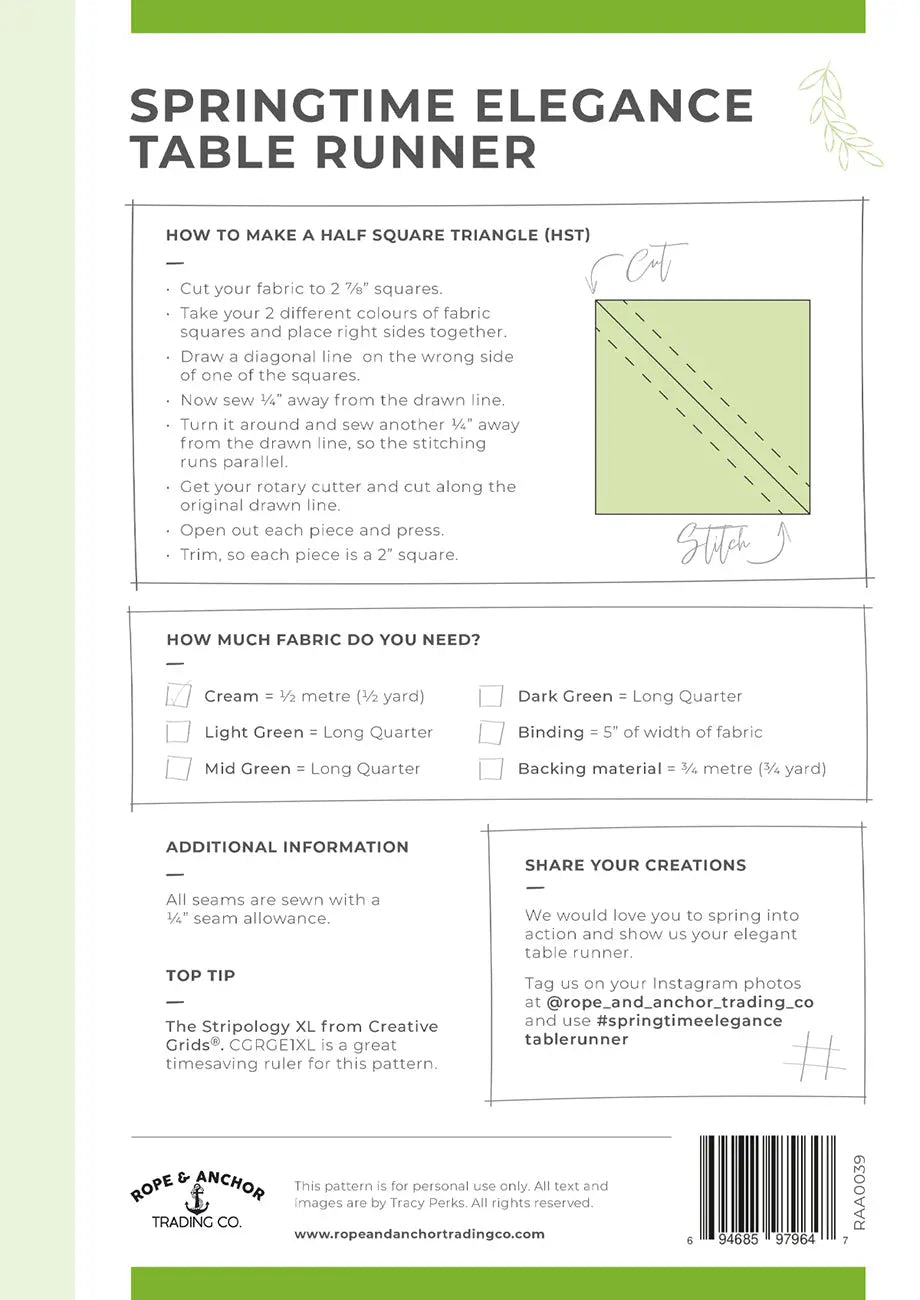 Make the seasonal Springtime Elegance Table Runner measuring 12” x 24”. Follow these instructions, complete with pattern illustrations, to make a table runner that is perfect for beginners!