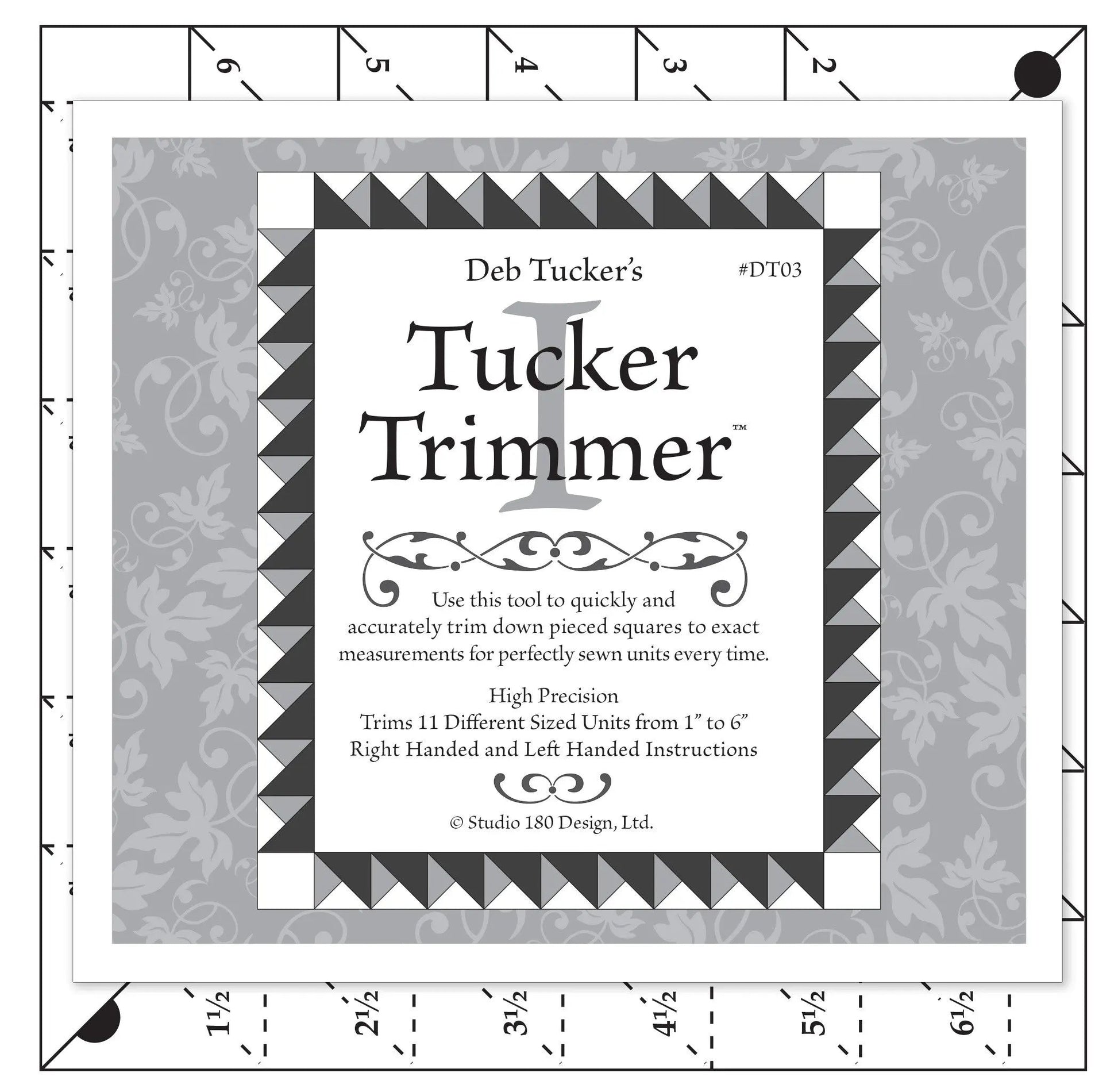 The Tucker Trimmer tool was designed to help quilter’s quickly and easily trim down units that are made with triangles: half square triangle squares, quarter square triangle squares (hourglass units), and combinations of half square and quarter square triangle squares (combination units). It has multiple diagonals which allow you to align ruler guide lines with unit seam lines to quickly locate the exact center of pieced units. This makes trim down easy, precise, and perfect every time. No more figuring, or guessing, or struggling to find a center point. I use it for much more than just trimming however and consider it my “must have” tool every time I head to my cutting table.